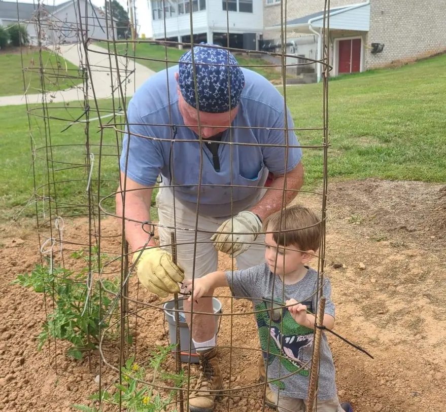 "Papa teaching Grandson how to stake tomato cages. "
