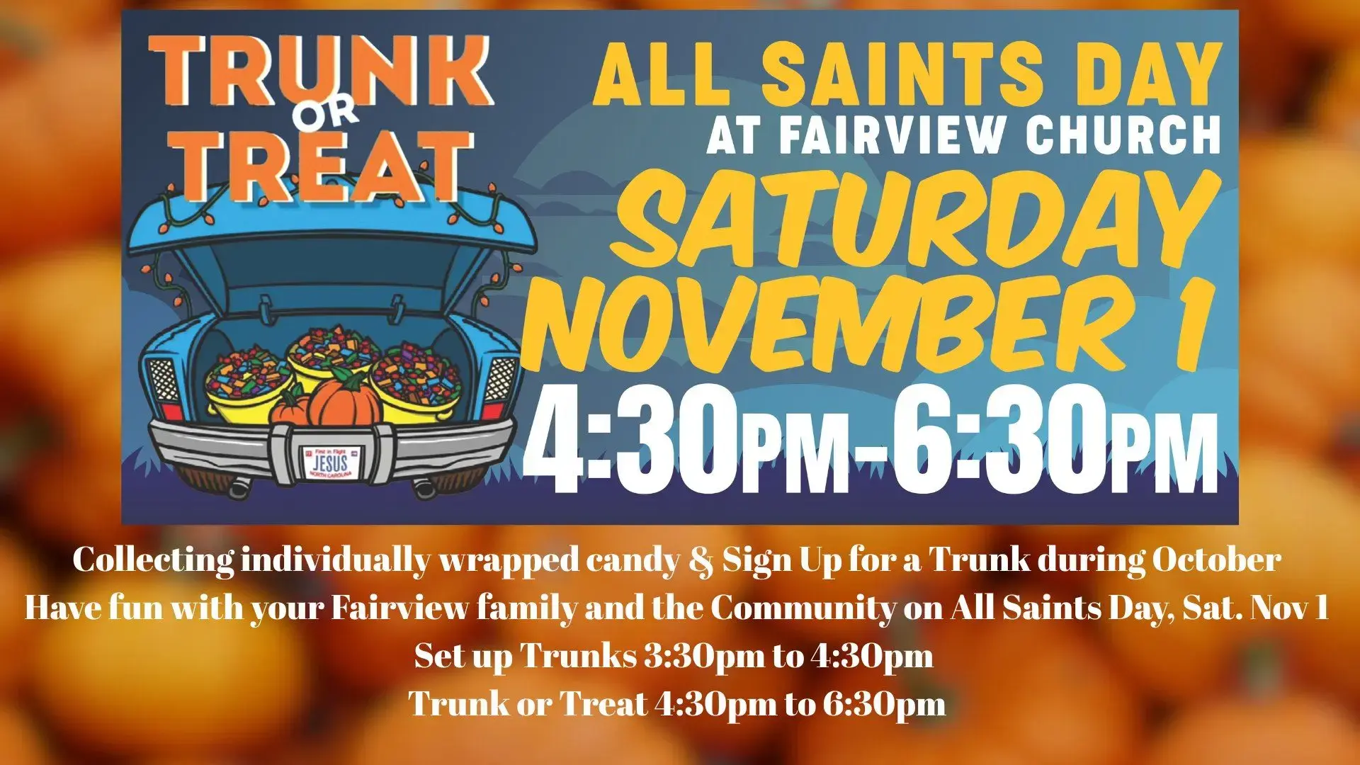 Fairview Church is hosting a Trunk or Treat on Saturday, November 1st from 4:30-6:30.