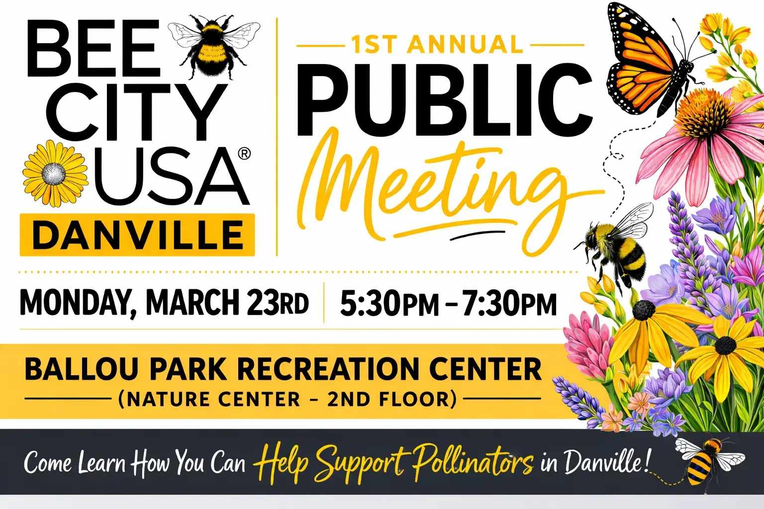 Danville is proud to be recognized as a Bee City USA, demonstrating our city’s commitment to creating healthy habitats that support pollinators, such as native bees, butterflies, moths, hummingbirds, and more.