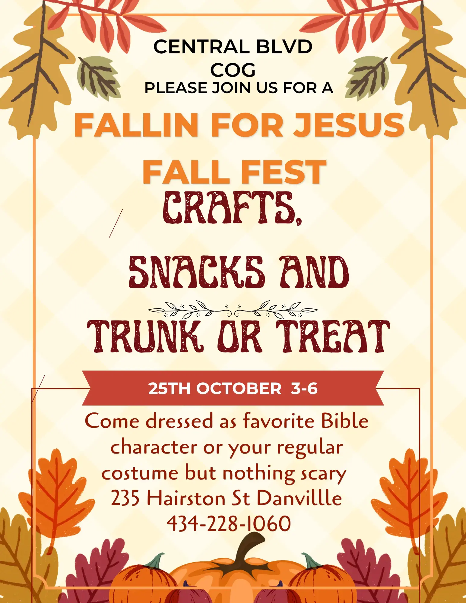 Central Boulevard Church of God will be hosting the “Fallin for Jesus Fall Fest” on Saturday October 25th from 3pm-6pm.