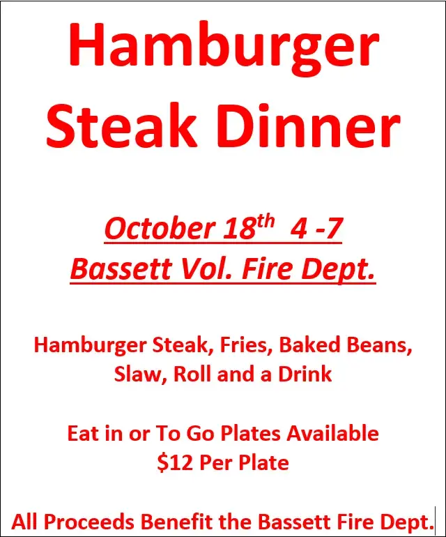 The Bassett Volunteer Fire Department will be having a Hamburger Steak Dinner on Saturday, October 18th from 4pm-7pm.