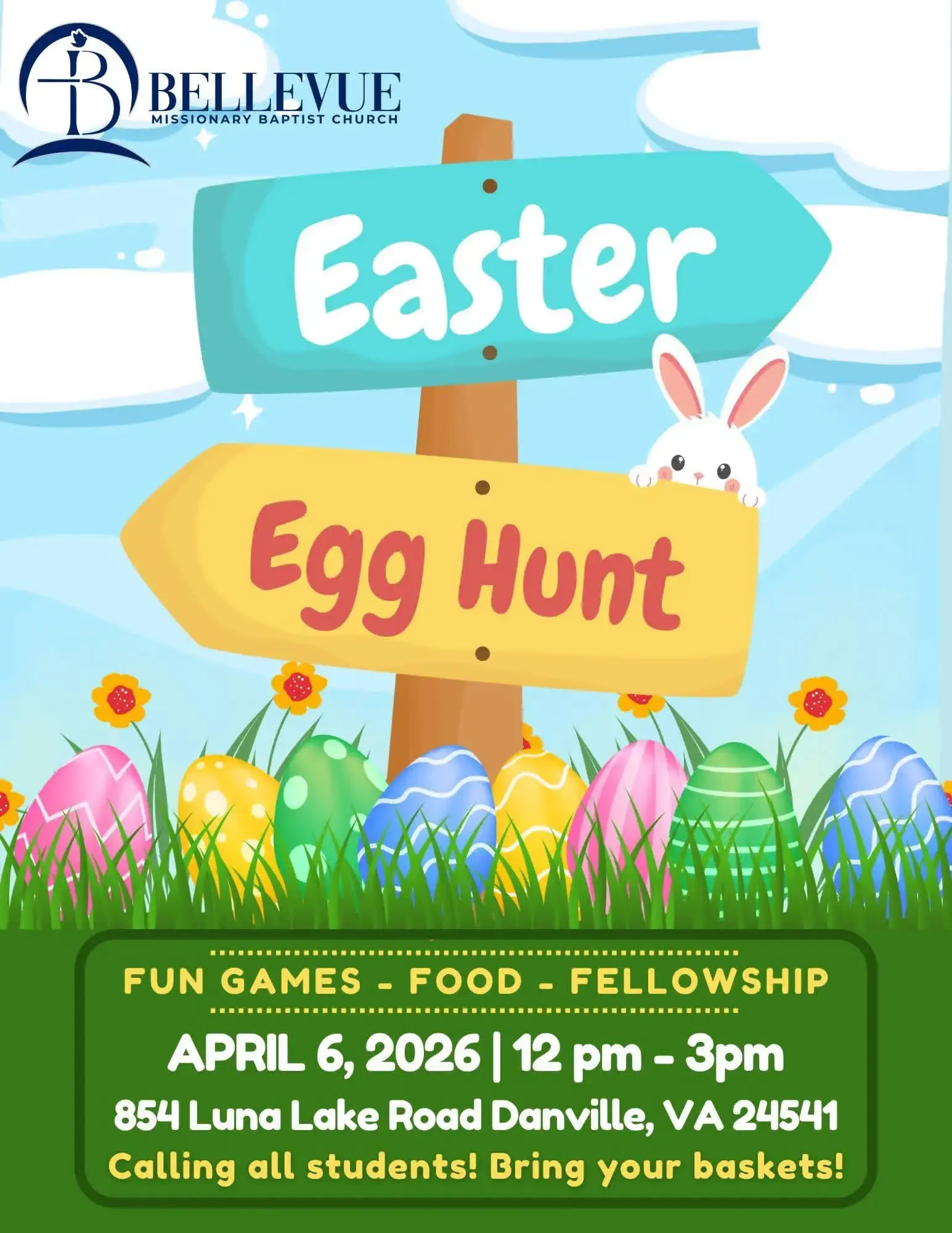 Bellevue Missionary Baptist Church will be hosting an Easter Egg Hunt on Monday, April 6th from 12pm-3pm. Students are encouraged to bring their baskets and have a blast!...