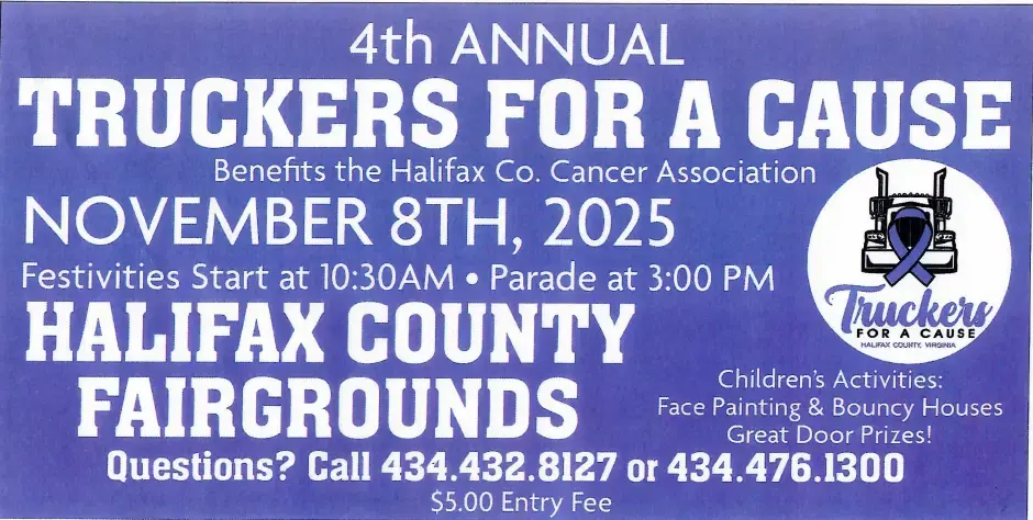 The 4th annual Truckers for a Cause parade will be taking place Saturday, November 8th at the Halifax County Fairgrounds! Proceeds for this event benefit the Halifax County Cancer Association. This is a parade of big trucks runs a 16 mile route starting at the Halifax County Fairgrounds. The fun gets underway at 10:30am! There will be surviving speakers, a survivor photo, along with gift card drawings. Trucks will be draped with banners as well as t-shirts available all to…...