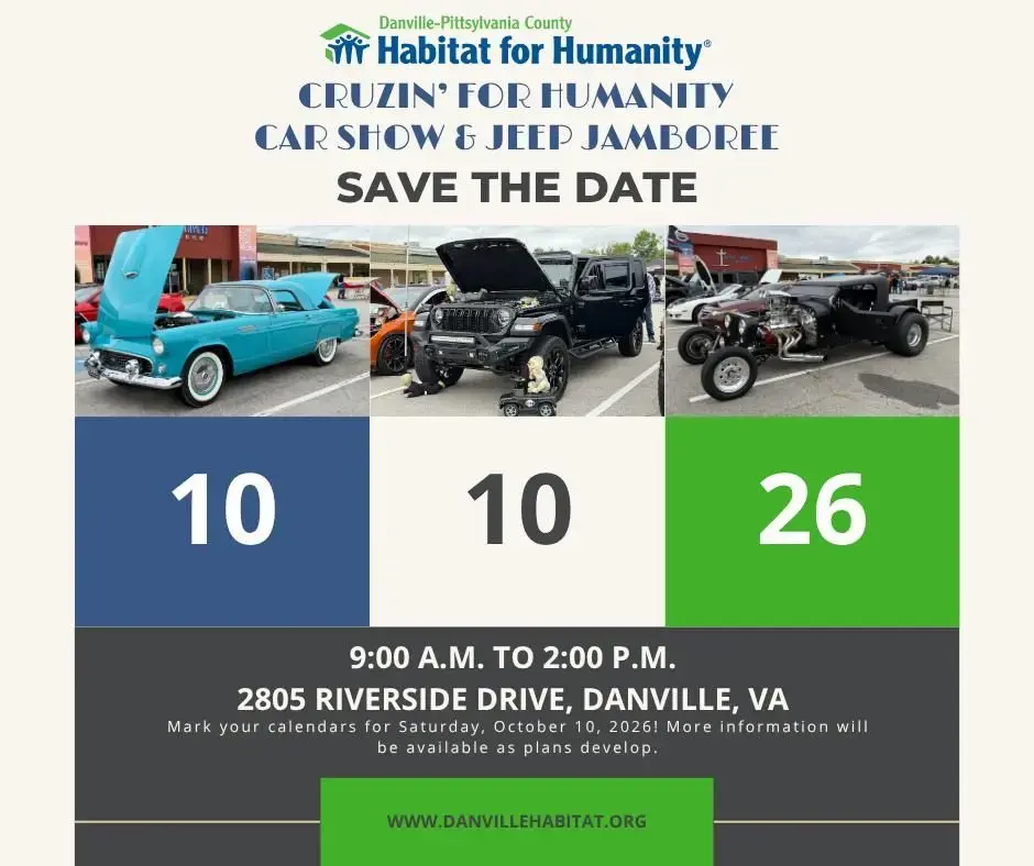 The Cruzin’ for Humanity event, a full day celebrating cars, Jeeps, community, and the mission of Habitat for Humanity will take place on October 10th from 9a-6p. This year’s event includes our traditional car show along with the debut of our first annual Jeep Jamboree. Guests can enjoy live music, great food, raffles, and activities for all ages. The event will feature live music from Remedy from 11:00 a.m. to 2:00 p.m. Food trucks will be on-site throughout the day,…...