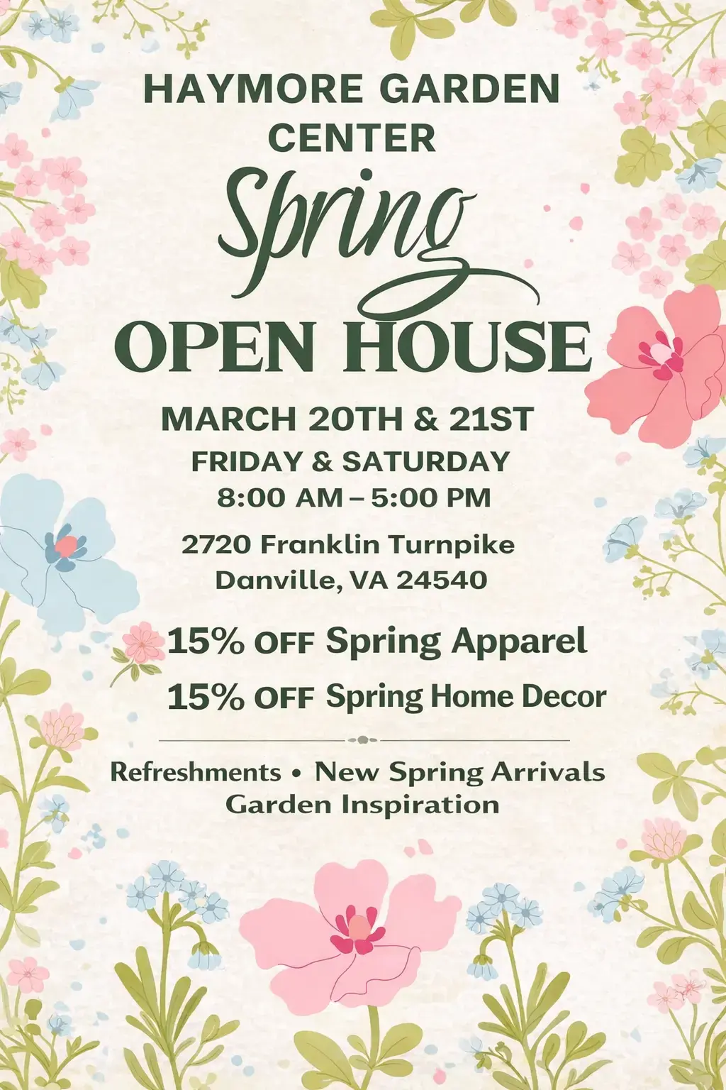 Haymore Garden Center is hosting a spring open house on Friday and Saturday March 20th and 21st. Find new inspiration for your home, enjoy refreshments, and take advantage of great savings....